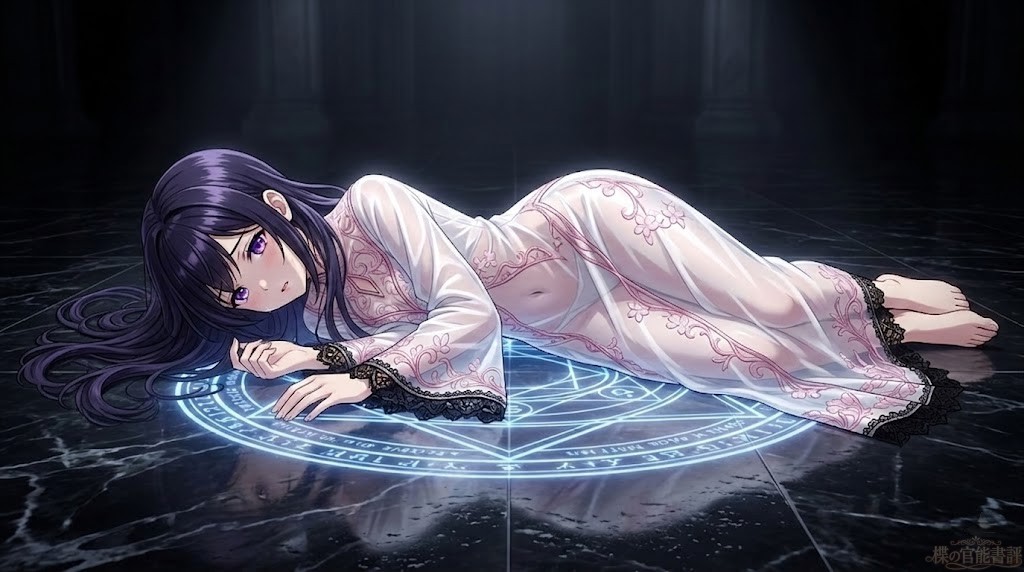 日常の残滓(ざんし)を一切許さぬ、冷徹な魔力の再構築。肌を包んでいるのは、かつての制服などではなく、薄氷のように透け、頼りなく肌に吸い付く白銀の薄衣(うすぎぬ)だけ。