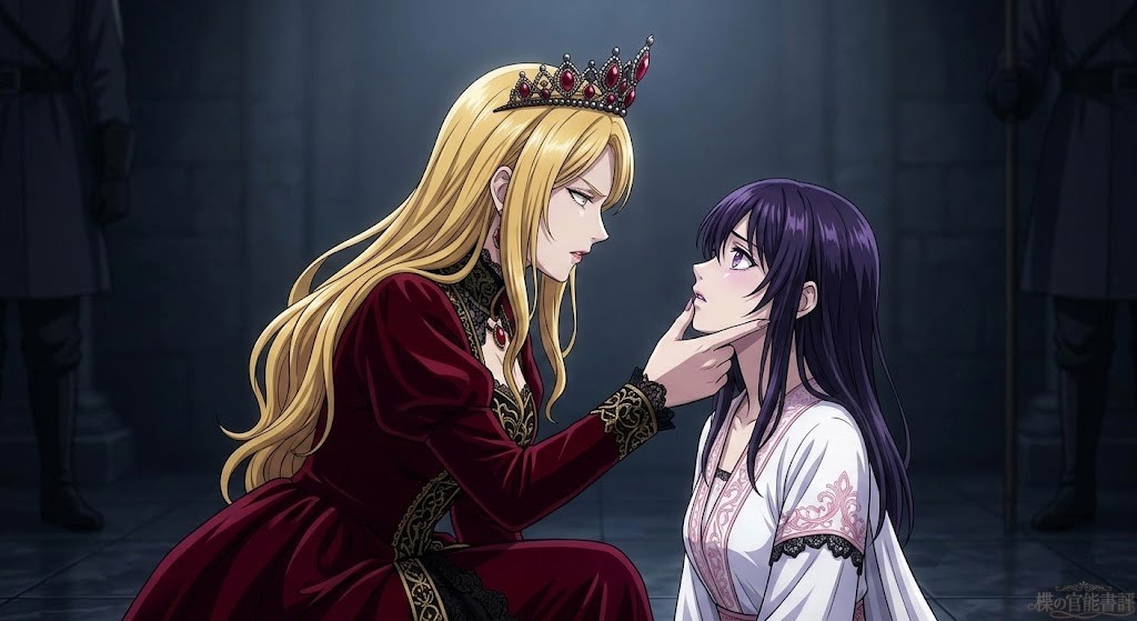 黄金の髪を高く結い、真珠色の瞳で楪を見下ろす――王妃プリシラ。