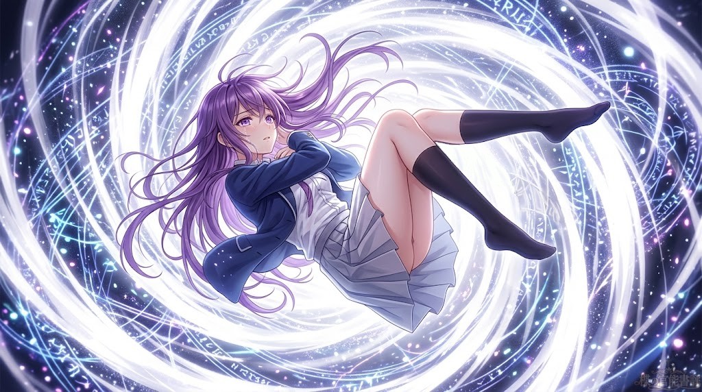 彼女の純潔の象徴であった「白いリボン」が、魔力に耐えかねて解け、彼女の深い紫を帯びた黒髪が、夜の帳のように宙で広がった。