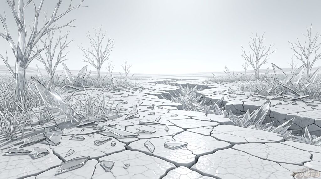 草木は色彩を奪われて透明な硝子へと変じ、触れれば微かな風圧だけで無惨に砕け散る。流れる水はその流動性を失って喉を焼く結晶毒となり、柔らかな土は熱を失い、芽吹きを永遠に拒絶する白磁の檻へと姿を変える。