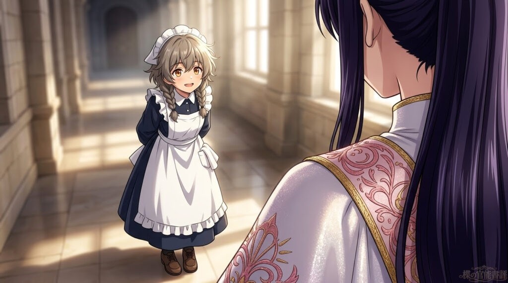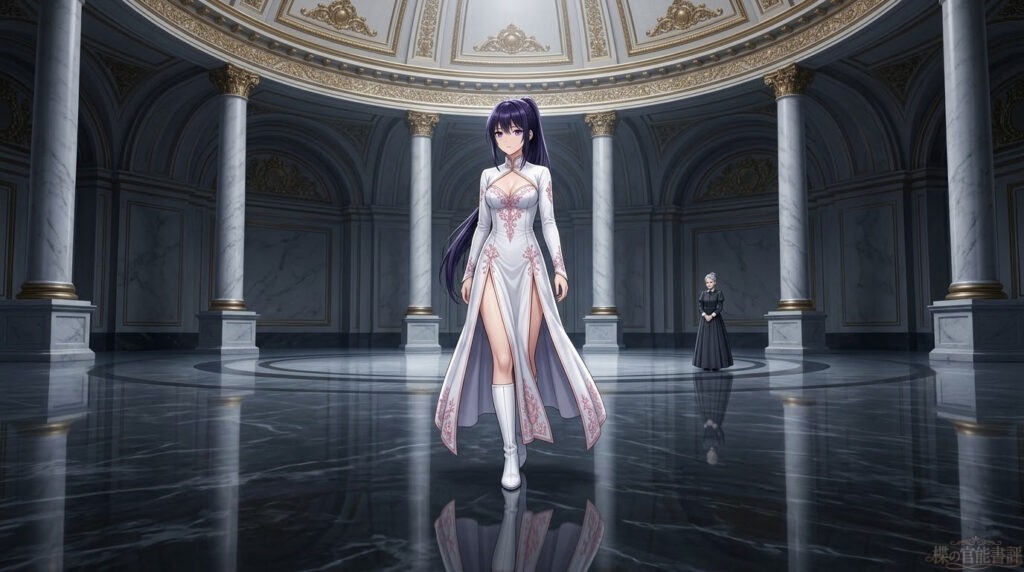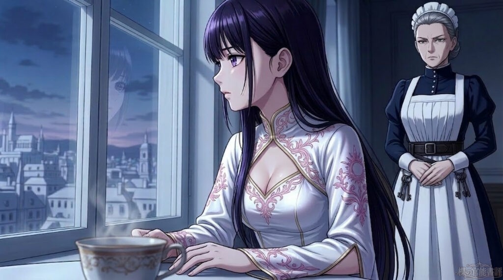 部屋の隅で見守るミーナが、心配そうに、けれど楪が姿勢を正すたびに「……わあぁ」と感嘆の吐息を漏らす。その無垢な期待と、エララ夫人の冷徹な視線。その二重の鎖が、今の楪には何よりも残酷だった。