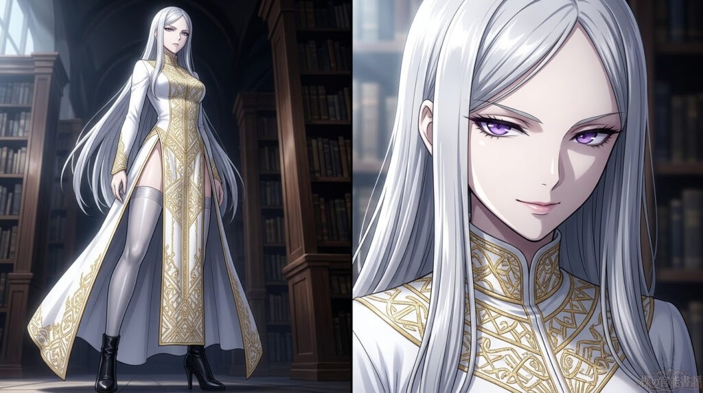プラチナシルバーの長い髪を揺らし、純白の法衣を纏った女性。身長172センチ。自分よりも遥かに高い位置から見下ろすその女性は、法衣の深いスリットから銀色のストッキングに包まれたしなやかな脚を覗かせ、紫水晶のような瞳で、じっと楪を射抜いていた。