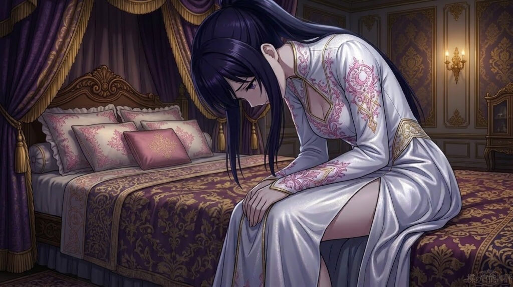 重厚な扉を閉め、ようやく一人の空間。楪は力なくベッドの縁に腰を下ろし、慣れないドレスの重みから逃れるように深く項垂れた。
